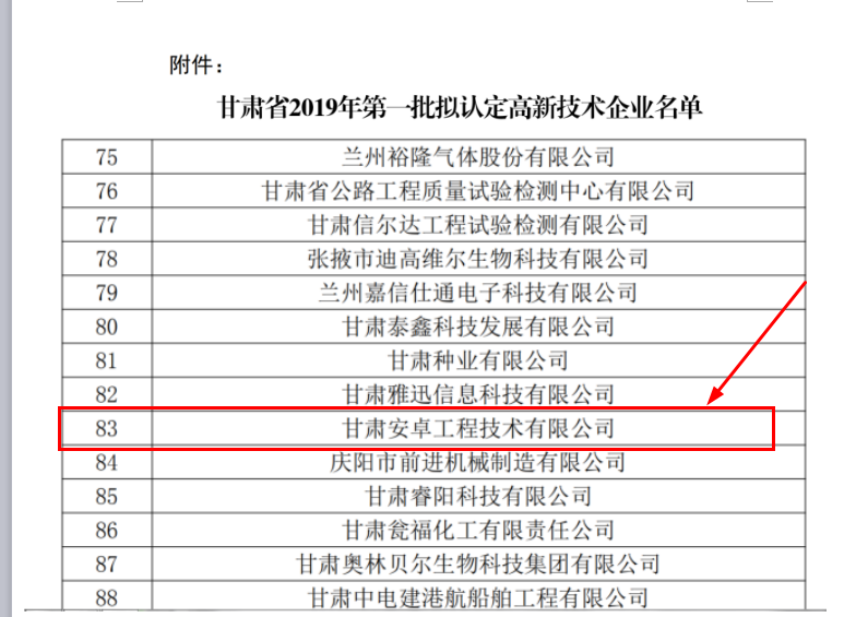 根據(jù)《高新技術企業(yè)認定管理辦法》(國科發(fā)火〔2016〕32號)和《高新技術企業(yè)認定管理工作指引》(國科發(fā)火〔2016〕195號)有關規(guī)定,經(jīng)公司申報、地方初審、專家審查等嚴格的申報程序,于2019年8月19日在“國家高新技術企業(yè)認定工作網(wǎng)”上公示了“甘肅省2019年第一批擬認定高新技術企業(yè)名單”甘肅安卓工程技術有限公司榜上有名。