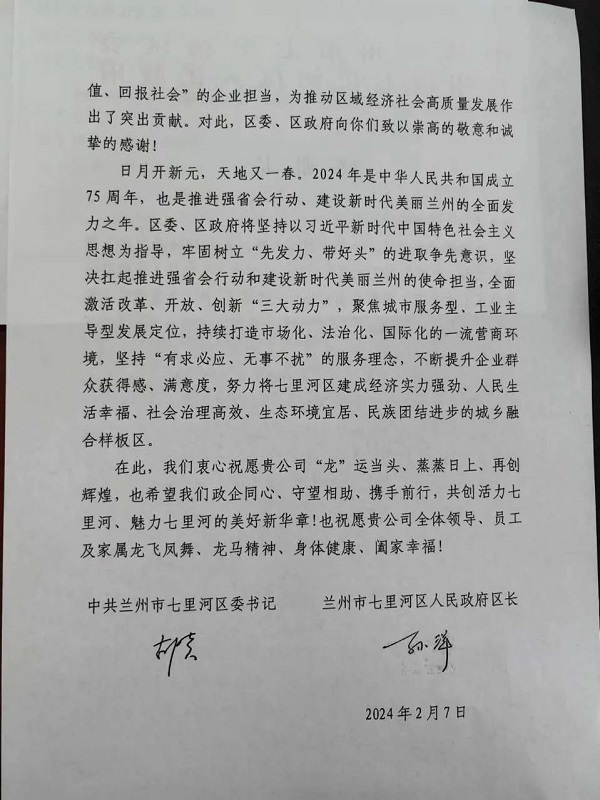 歲末年關(guān),新春將至。近日,中共蘭州市七里河區(qū)委、蘭州市七里河區(qū)人民政府發(fā)來感謝信。