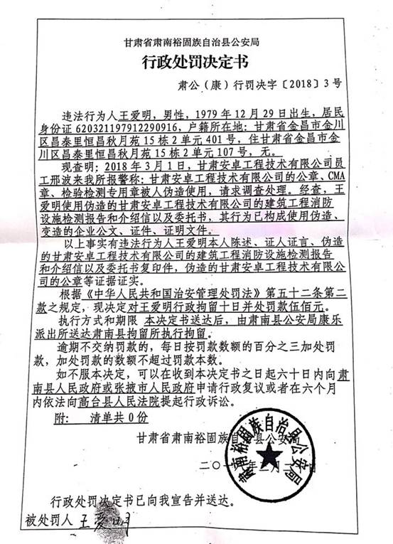 《甘肅省肅南裕固族自治縣公安局行政處罰決定書》肅公(康)刑罰決字【2018】3號(hào)文件,查明王愛明偽造甘肅安卓工程技術(shù)有限公司的建筑工程消防設(shè)施檢測報(bào)告、介紹信、委托書、公章等違法事實(shí)。